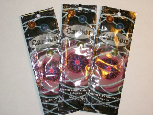 3 packets ultimate Carbon Extreme Dark Accelerator w/ Tyrosine Complex 11 ozCollagen based UV amplifying formula with Biotanning®, Tyrosine Complex, Copper, UnipertanTM and Carrot Seed Oi. Skin firming, anti-aging and complexion balancing formula features Red Algae, CoQ10, Caffeine, Collagen, Soy, Seaweed, Caviar Extract, Oyster Extract, Vitamin A, Vitamin C Vitamin E and Vitamin K. Ingredients include: Aloe Vera, French Virgin Hemp Seed Oil, Japanese Green, Chinese White Tea, Sesame Oil, Chamomile Extract, Shea Butter, Jojoba Oil and Botanical Extracts.